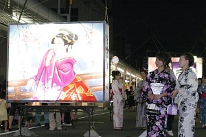 期間中、家々では青竹に五色の短冊や吹流し等をつり下げて門前に飾るほか、浮世絵美人が描かれた大・小百数十基の絵どうろうが通りに下げられます。