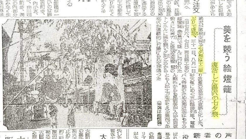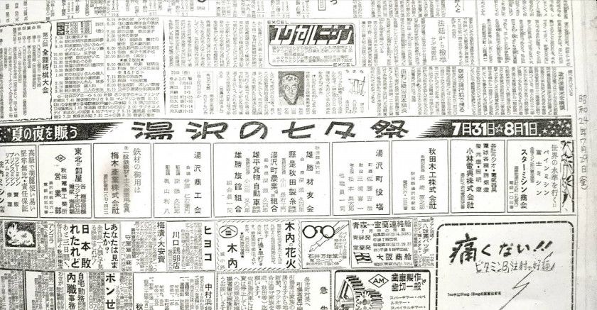 戦後はじめての七夕まつりは、昭和24年7月31日と8月1日に行われました。このときは「湯沢の七夕祭」というタイトル。